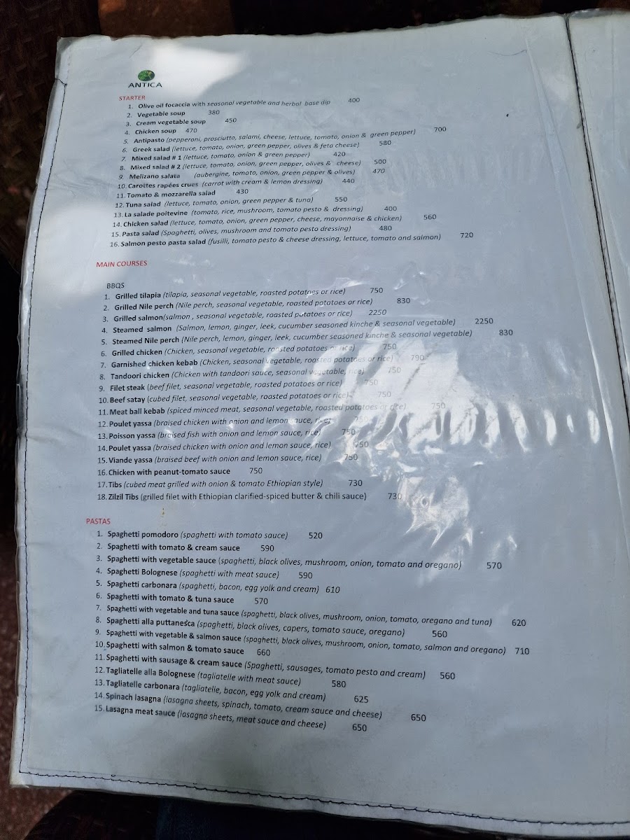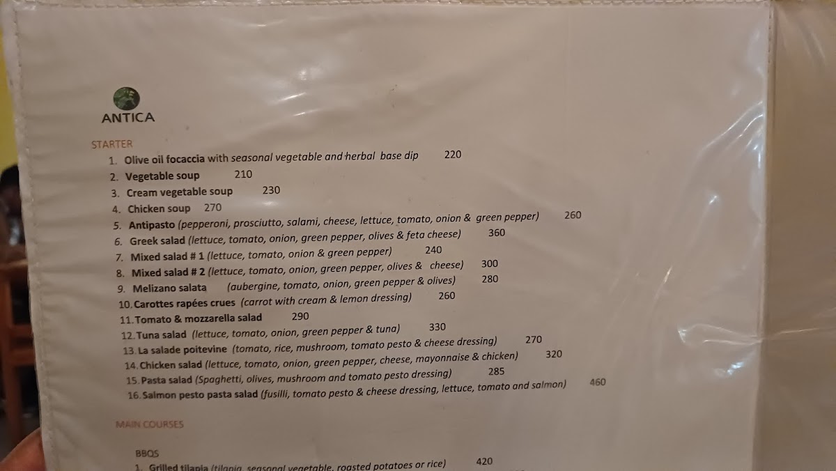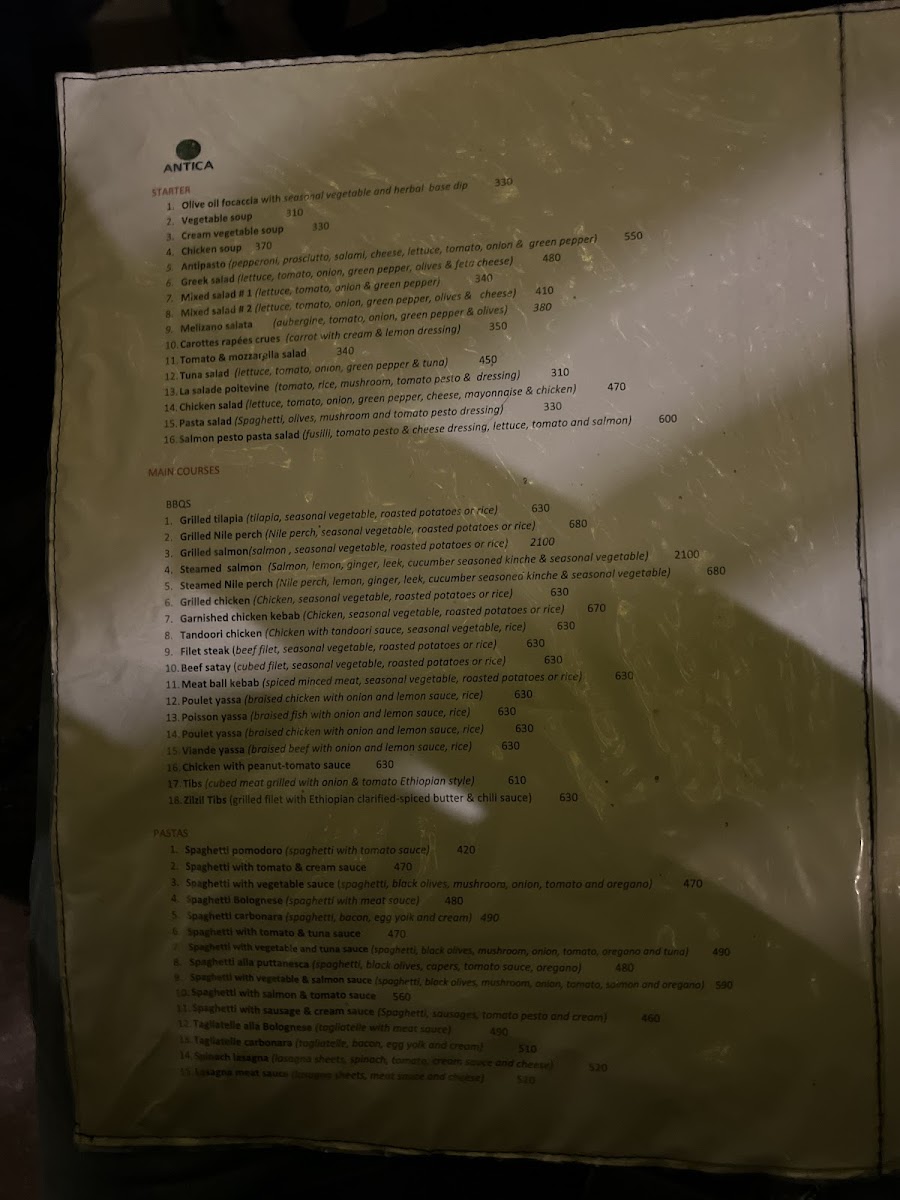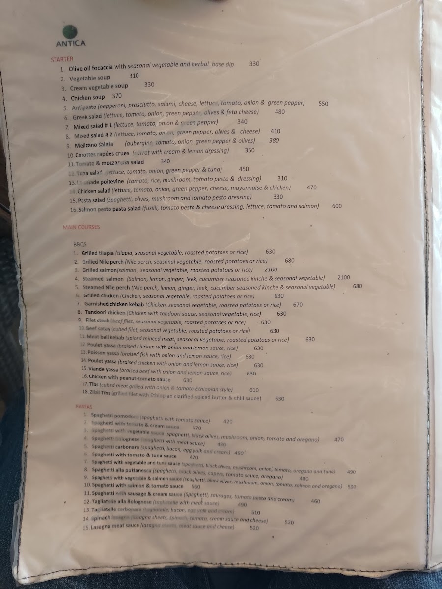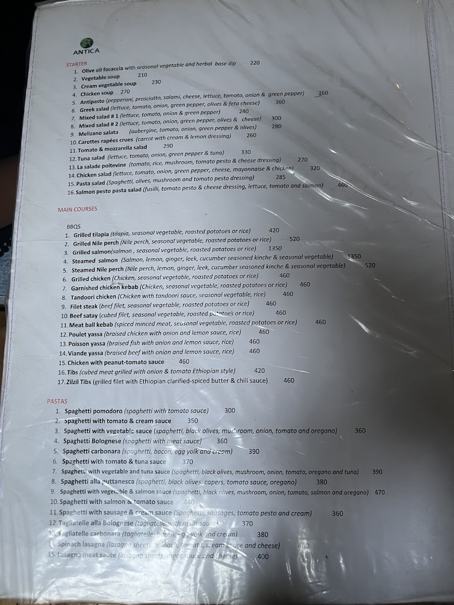 The menu at Antica Bar & Restaurant in Bole, Addis Ababa, offers a rich selection of both local and international dishes, each crafted to satisfy diverse tastes. A standout choice for pasta lovers is the Lasagna, a hearty and comforting dish that perfectly blends layers of meat, cheese, and pasta. For those in the mood for something more indulgent, the Steak options, cooked to your preference, are a must-try. The Grilled Fish & Veggie provides a lighter yet flavorful alternative, ideal for those who appreciate a balance of protein and fresh vegetables. If you're seeking a creamy delight, the Tagliatelle with Cream Sauce will surely satisfy your cravings with its rich and velvety texture.